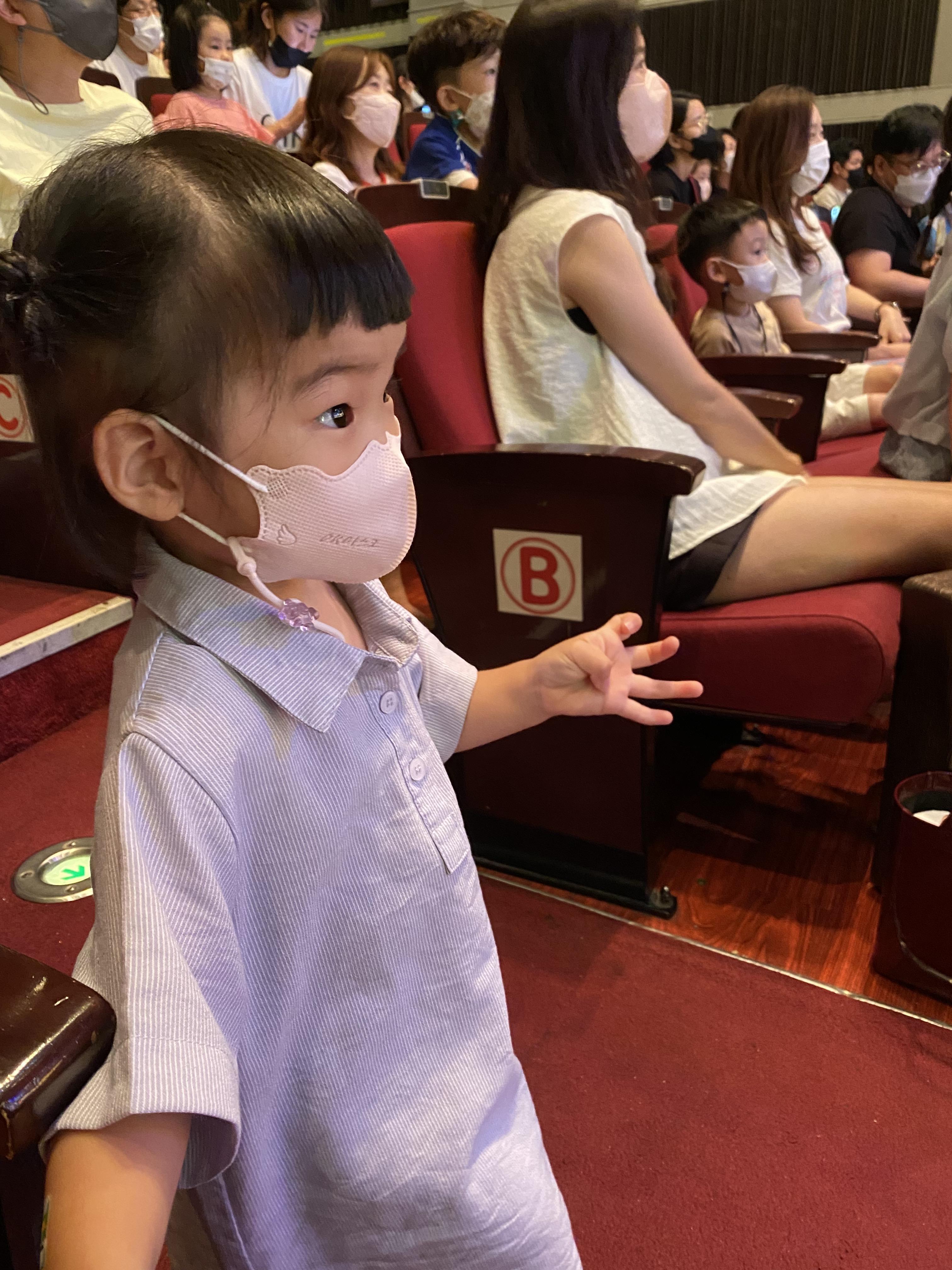 아직 너무 작아서 무대가 잘 안 보일 것 같아 좌석 옆쪽에 구비된 아기 쿠션을 깔고 앉았다.